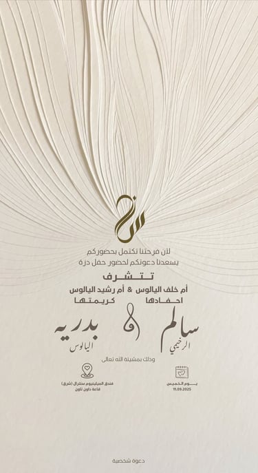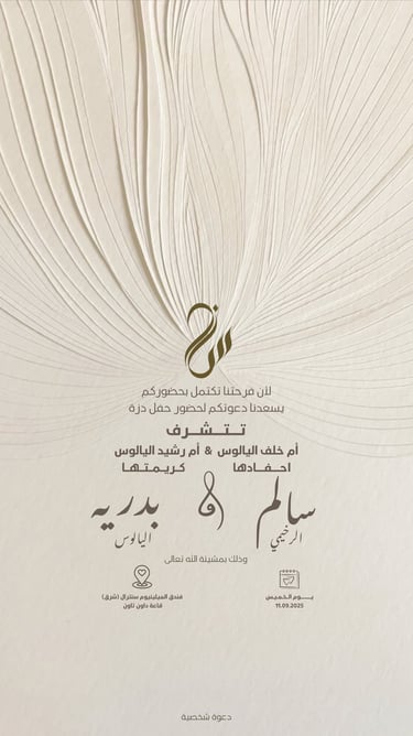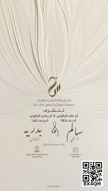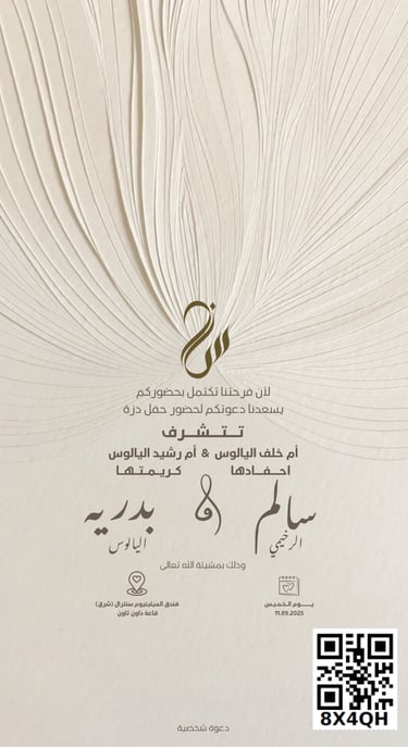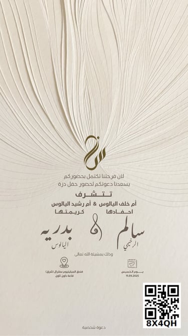 تصميم راقي فيه جميع التفاصيل يرسل مع الدعوة وطلب تأكيد الحضور، مع تصميم آخر يحتوي الـ كيو ار يرسل لمن أكد حضوره بحسب عدد الدعوات المخصص من قبلكم لكل مدعو.